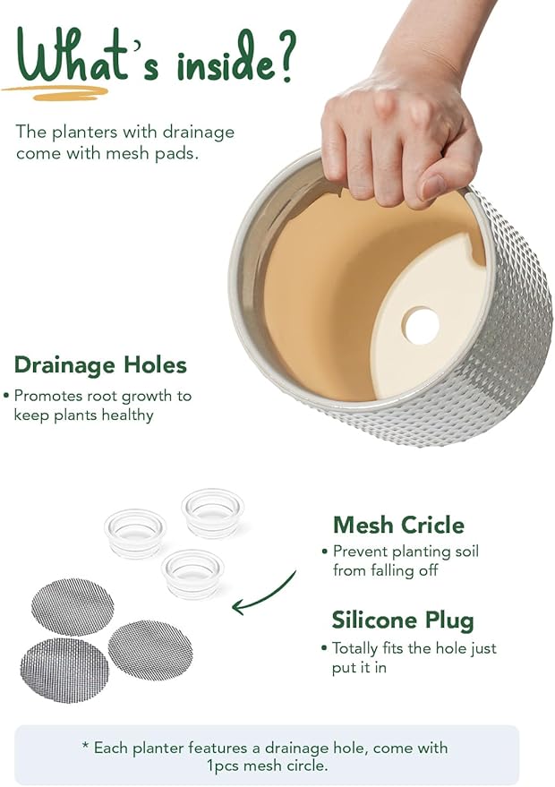 • Drainage Hole and Accessories: Each ceramic pots for plants features carefully designed drainage hole to maintain optimal soil moisture; the inclusion of silicone plugs and mesh pads provides added convenience, giving you flexibility in how you care for your plants