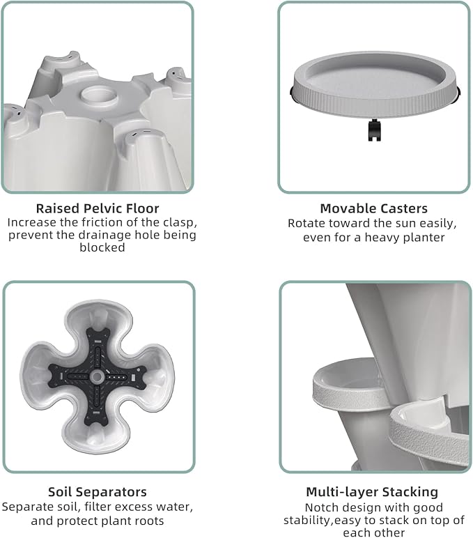 - Flow Design - The water filtration system from top to bottom can save water and retain moisture but prevents overwatering or root rot. 5 filters are placed on each level to keep the soil from going through the big drainage holes, it also helps retain water in each planter level.