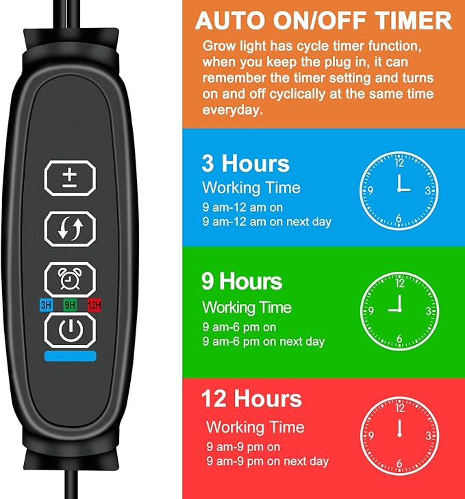 - Timer and Dimmer Function:This indoor seedling light offer the circular memory timer function with 3 options-3/9/12H. When keeping power, it can automatically turn on and off every day according to your settings.【 You Could Operate One of Them Separately and Support 10 Levels of Dimming.】