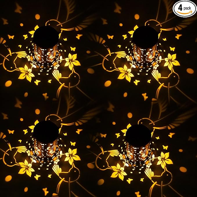 Mothers Day Gifts, 4 Packs Solar Lanterns Outdoor Hanging Lantern Lights, 4 Hummingbird Hollowed-Out Metal Decor Lantern, Waterproof LED Decorative Garden Light Gifts