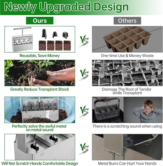 • 【Easy to Sow & Transplant for High Germination Rate】NVRGIUP soil block maker can makes four 2-inch cube design soil blocks at a time, protects the seed roots well to ensure even soil fill and complete seed transplanting. Our handle-type soil clod maker can increase air circulation, having healthier root system and easy for the plant acclimate to garden soil at transplant. Effectively prevent the roots from being pruned by air, transplant shock, stunting, slow growth.