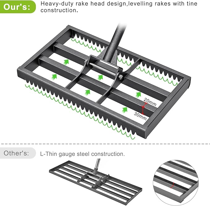 - ๐๐ข๐ ๐ก ๐๐ฎ๐๐ฅ๐ข๐ญ๐ฒ ๐๐๐ญ๐๐ซ๐ข๐๐ฅ: The main pole of lawn leveler rake made of 1.5mm thick steel tube, very strong and not easy to deform or break, heavy duty 20x30mm square steel for the ground plate connects to the handle are solid,anti-scratch powder coated finish for durable use.