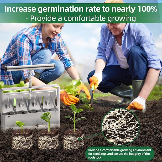 - 【No Transplant Shock, No Pot Needed Soil Blocking Tool】Our 4-cell soil block maker helps seeds grow on 2 inch soil blocks directly, minimizes damage to fragile root systems during transplanting and avoids root binding is the perfect eco-friendly replacement for plastic pots and cell trays, saving your money and energy. Durable rust-free material ensures easy cleaning and years of repeated usage, helping your seed starting without plastic waste or mess.