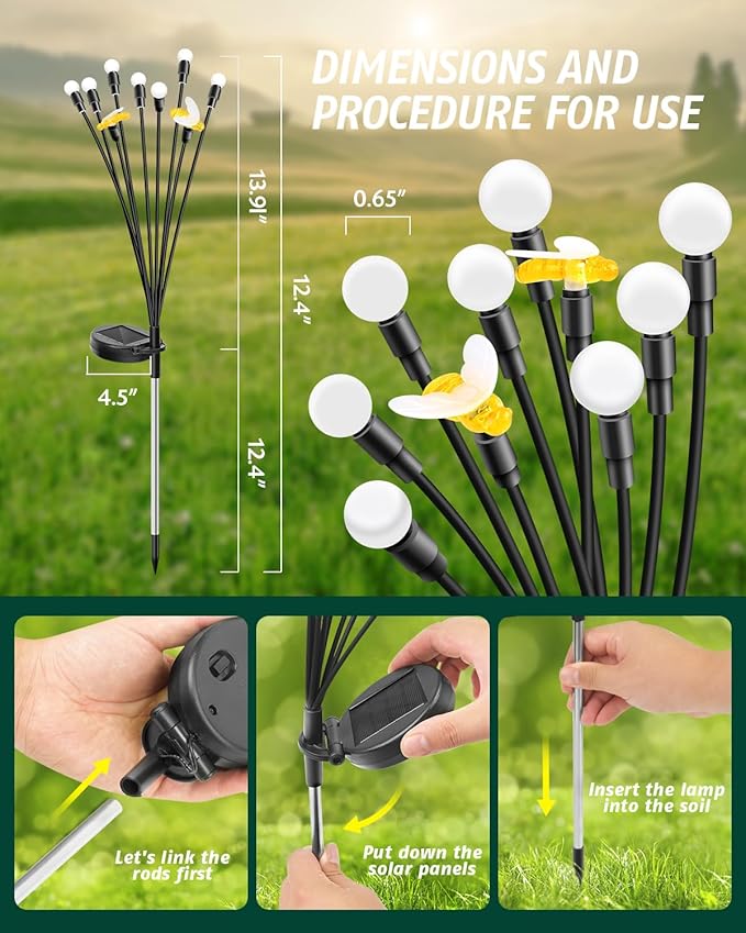 - 2024 Upgraded Solar Garden Lights: The most unique solar garden lights are not monotonous, 8 firefly lights +2 bees, more vivid and natural