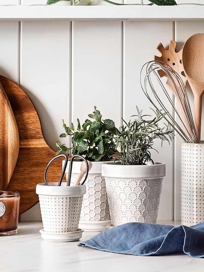 - Decor Living Space: Discover a cute embossed design in a compact 4-inch size – good for planting succulents and cacti. These ceramic flower pots add a touch of green to tables, windowsills, balconies, or bookshelves. The delicate balance of embossed design and botanical vitality converges, creating an atmosphere of unparalleled grace and visual delight