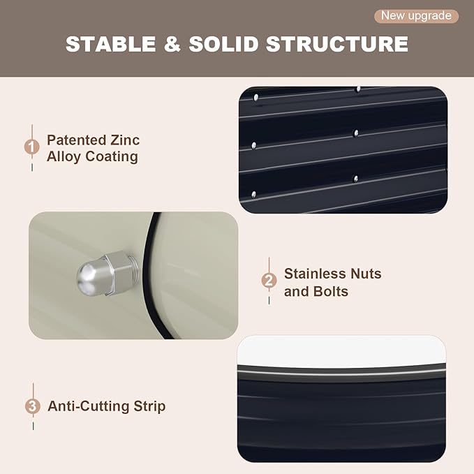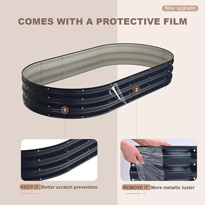 - DURABLE DESIGN: This galvanized raised garden bed, with a Zinc-Aluminum coating, is designed to enhance longevity and withstand various environmental conditions. The coating helps prevent oxidation and increases surface hardness. Its thickened design and oval shape ensure even pressure distribution, making it highly resilient against external forces. Reusable for years