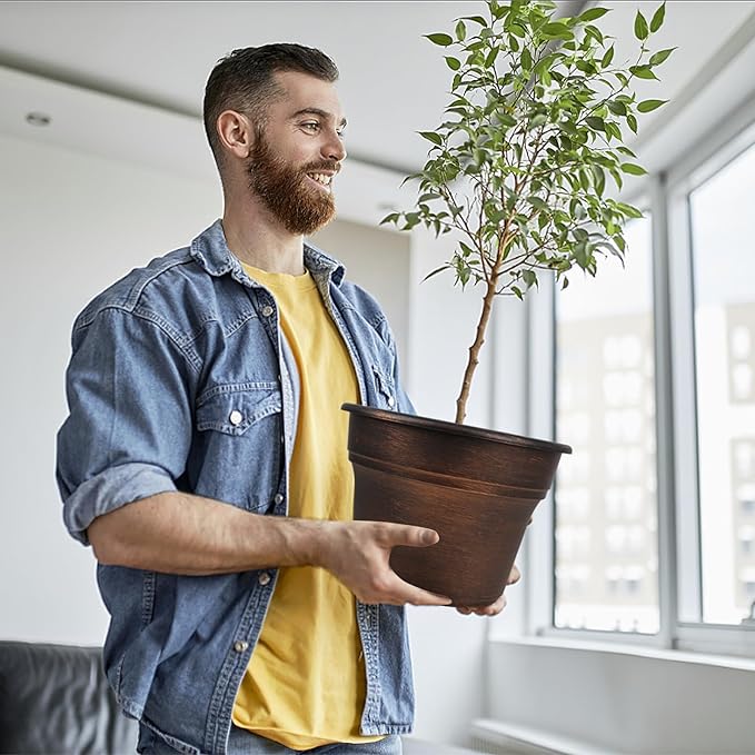 - 【TRADITIONAL DESIGN】Plastic planters for indoor plants with trays are designed in dark gold colors & a classic round look, which allow this pot to fit into any indoor & outdoor setting. With these golded flower pots, it could adds fresh, decorative flair to your home. Decorate your windowsill, desktop, shelf, bedroom, living room, kitchen, garden, office with our 9 inch plastic plant pot.