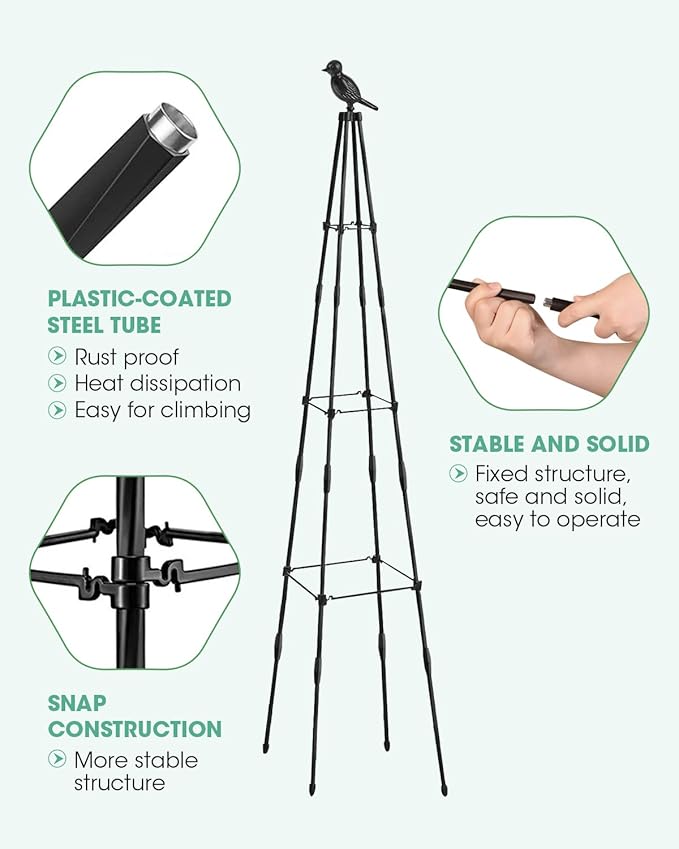 - Rustproof Material & Strong and Sturdy: Material of our garden obelisk trellis: Metal Pipe with PE Plastic Coating, can prevent the inner iron pipe from rusting, waterproof, sun protection, durable and long service life. It is permitted outdoors or indoors for climbing plants, potted plant, flowers, tomato etc.