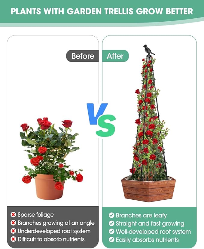 - What You Will Get:2 pack garden trellis, a roll of garden plant ties, 2 pcs top connectors. Garden trellis is not only practical, but also adds beauty to your garden. It is beautifully designed and can be combined with a variety of flowers and horticultural elements to create a unique and eye-catching garden landscape. Ideal for indoor potted plants, vines, trellises, cucumbers, tomato cage, peas, jasmine and other plants.