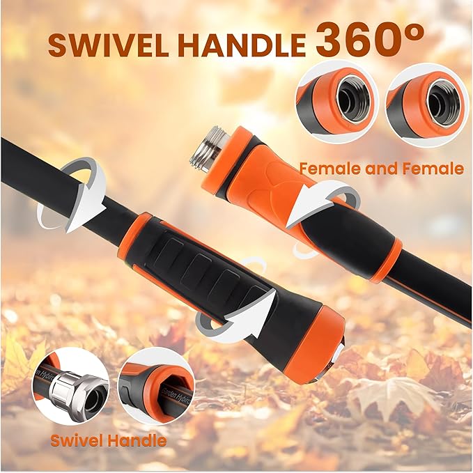 - Swivel Handle - The movable handle allows the hose to rotate freely to prevent twisting, the handle can also fix the fitting to make the connection with faucet/nozzle/sprinkler/hose reel more easily and effortlessly.