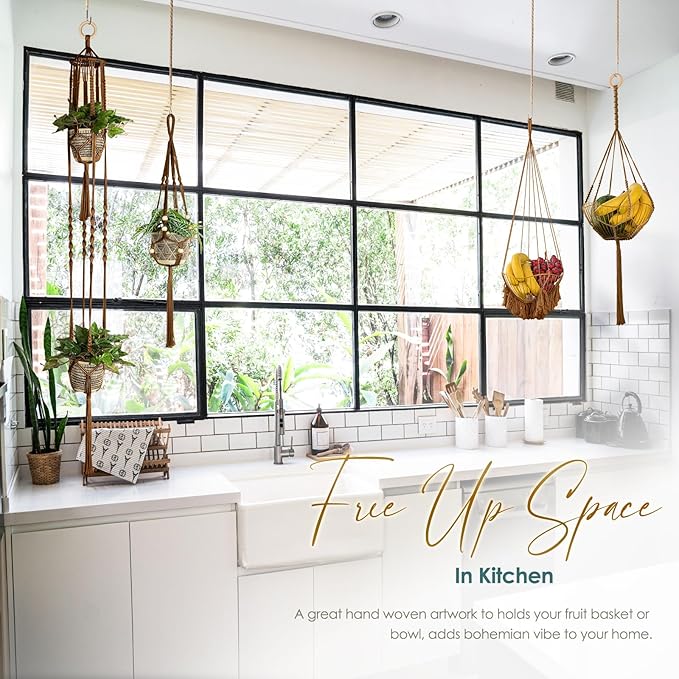 - FREE UP CORNER SPACE: Macrame plant hangers are the perfect small space solution because they can be hung on the wall or from the ceiling, freeing up shelf space for other things. Also, A great hand woven artwork to adds bohemian vibes to your home, kitchen, nursery, indoor garden, bedroom, living room, dorm, offices, studio and so on, brings a unique decorative piece to style your space and great way to show your plants, create your own urban jungle.