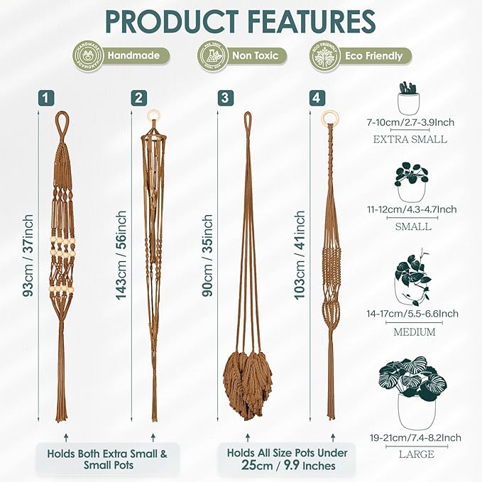 - EASY TO INSTALL & VERSATILE: No assembly required, the boho hanger set comes ready to use. For using, you can just hang it on a sealing hook, wall hook, curtain rod or anywhere you would like it to be. Double tier hanger and wooden bead hanger only holds small pots under 4" in diameter; Fluffy tassel hanger and classic hanger can holds pot or bowl size under 9.9 inches in diameter. Please check the pot size before you make a purchase.