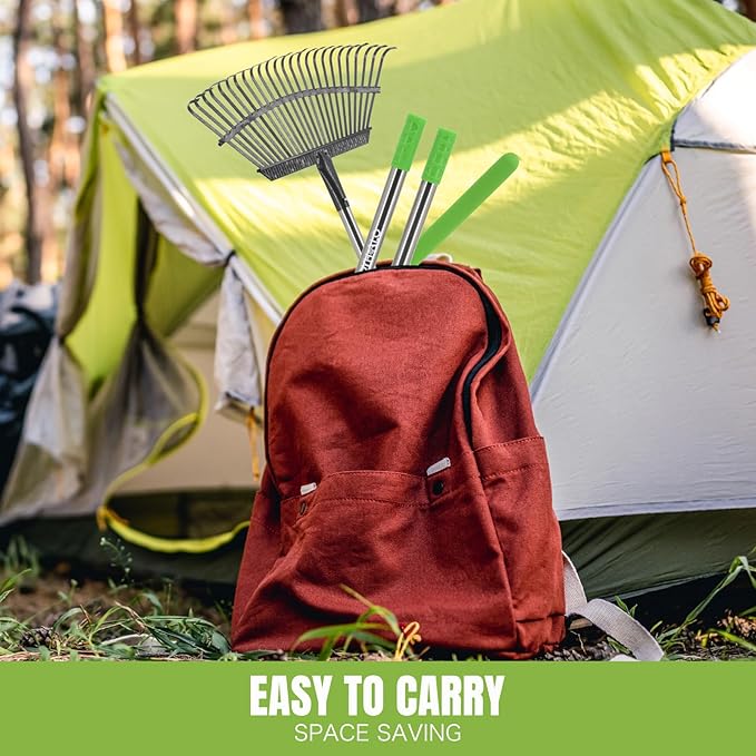 - Easy to Install & Carry: This collapsible lawn rake is able to fit into your backbag or bike rack for outdoor activities like dog poop rake, campsite debris rake; Can be installed in a minute without any tools