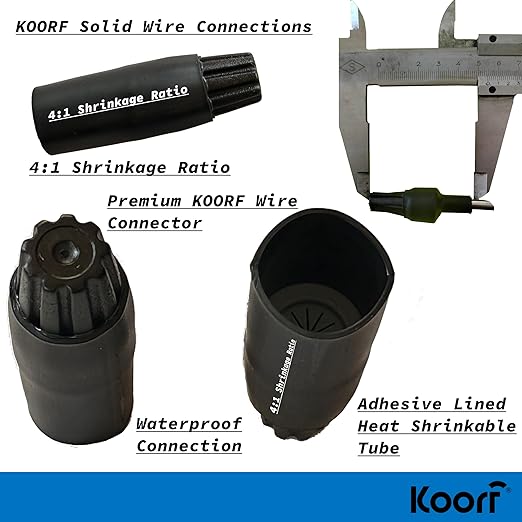 - ✔ AMERICAN OWNED AND OPERATED SMALL COMPANY: U-V resistant waterproof wire nuts that can withstand a 600-volt surge, for connections exposed to condensation, water, vapors, or dust, for use in outdoor lighting, outdoor wire and cable connectors to avoid short circuits in any exposed wiring. Efficiency: Shrink tubing able to shrink to 4:1 ratio. Easy size selection heat shrink connectors. A strong adhesive tubing prevents wires from being loose due to shaking or pulling. Copper to copper connections only. PREMIUM wire nuts for any INDOOR & OUTDOOR application. Quick connect wire connectors. Wire connectors heat shrink with Exclusive Features only from KOORF, your American Brand.