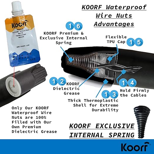 - ✔ GUARANTEE: Our outdoor waterproof electrical connectors provide a much more competitive and distinctive effect than others. It is a high-quality waterproof wire connector. Changing small tools will lead you to prevent further disasters. Choose the extra safe waterproof wire connector for indoor, and outdoor usage, automotive wire, and landscape lighting. We ONLY use our Own KOORF PREMIUM DIELECTRIC GREASE to fill all our products.
