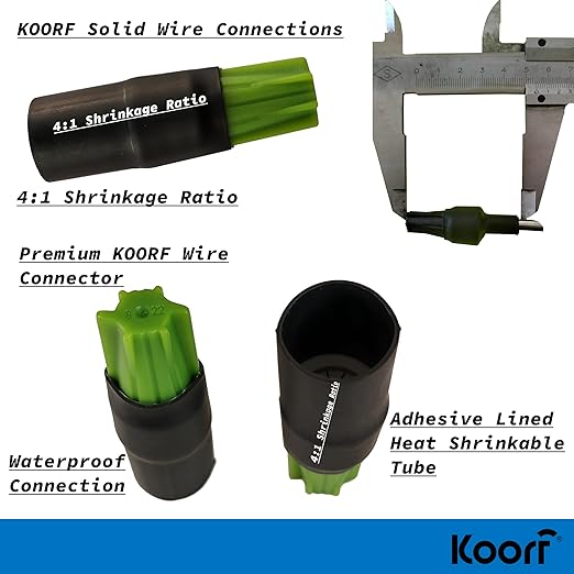 - ✔ AMERICAN OWNED AND OPERATED SMALL COMPANY: U-V resistant waterproof wire nuts that can withstand a 600-volt surge, for connections exposed to condensation, water, vapors, or dust, for use in outdoor lighting, outdoor wire and cable connectors to avoid short circuits in any exposed wiring. Efficiency: Shrink tubing able to shrink to 4:1 ratio. Easy size selection heat shrink connectors. A strong adhesive tubing prevents wires from being loose due to shaking or pulling. Copper to copper connections only. PREMIUM wire nuts for any INDOOR & OUTDOOR application. Quick connect wire connectors. Wire connectors heat shrink with Exclusive Features only from KOORF, your American Brand.