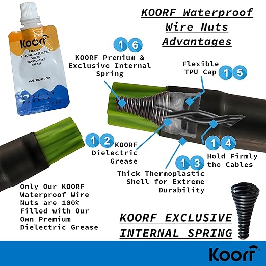 - ✔ UL LISTED: Easy-to-use waterproof wire connectors 50 Pack filled with premium KOORF dielectric grease, others products came filled with “Silicone Grease”, “Silicone Sealant” or even only “Silicone” with low-quality sealant, in few weeks that type of sealant will be evaporated or hardened leaving your connectors and wires open to a possible shortcut with all the risks, we only use our own KOORF Dielectric Grease to fill our products