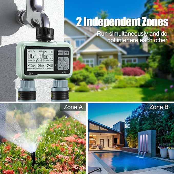 - Manual Rain Delay Function - This new upgraded digital garden water timer for 2024 features a manual rain delay function. Apply flexibly during the rainy season to delay your set watering schedule to prevent overwatering and keep your lawn and plants healthy, also saves you time and effort manually rescheduling your watering schedule