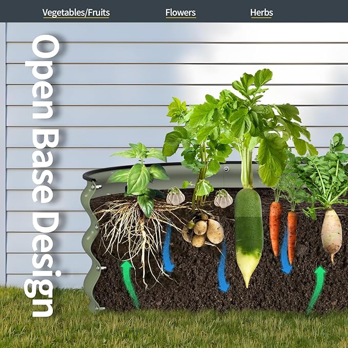 - Open Bottom Design: Open base provides good drainage and effectively protects the roots from rotting due to excessive watering.Metal garden bed allow you to enjoy fresh and healthy vegetables,fruits and flowers in your backyard, garden and greenhouse.