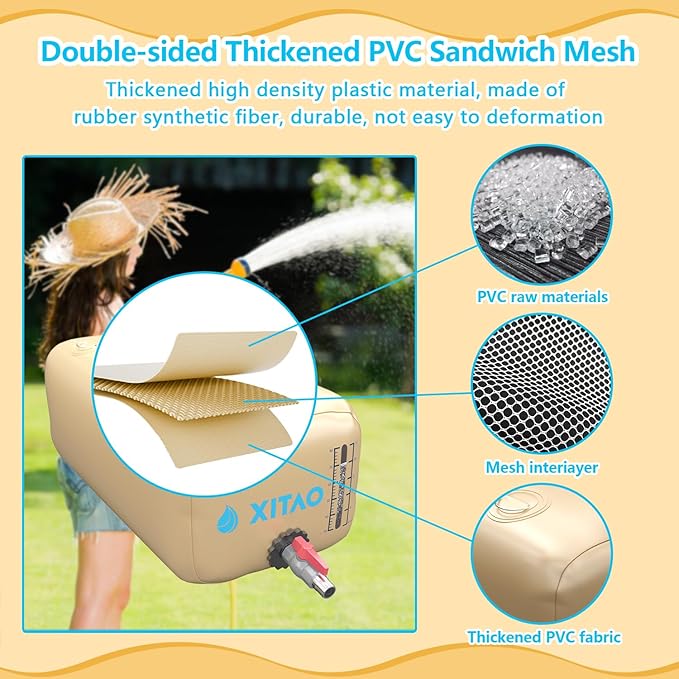 - 【Easy to Use】The top of the water bag is the water inlet, and the bottom is the water outlet. Just turn on the water outlet valve, and you're ready to fill water troughs, water your garden, and more. The water barrel features a foldable design for easier carrying and storage. You can leave the water barrel in your garage or utility room when not in use, saving you even more space.