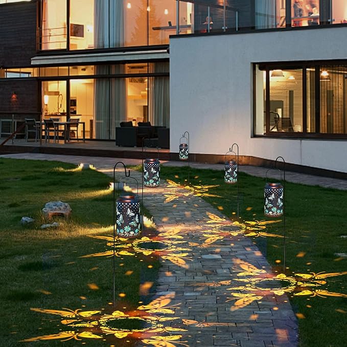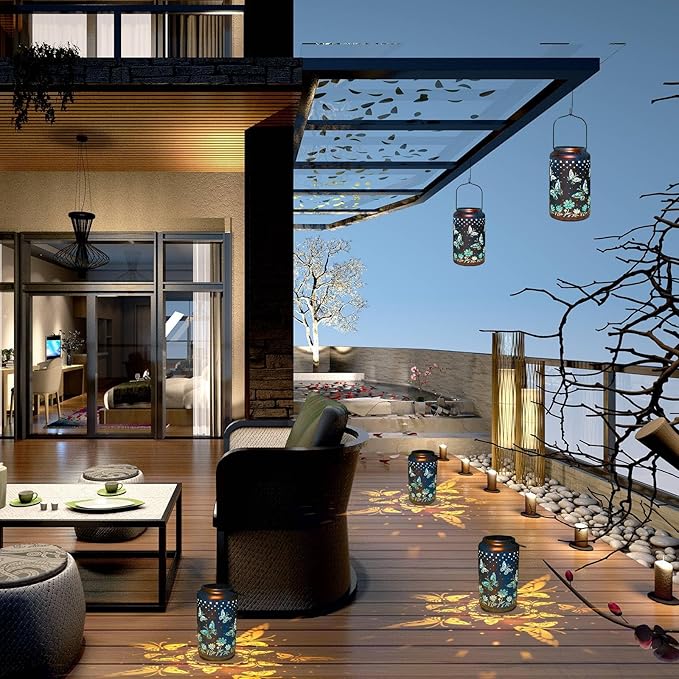 - 【Gorgeous Design】-- The outdoor solar lanterns combine vintage Blue and butterfly patterns. The decorative lantern emits soft golden light at night and displays dynamic and beautiful patterns on the table or ground. It is a gorgeous and unique outdoor garden yard decor.