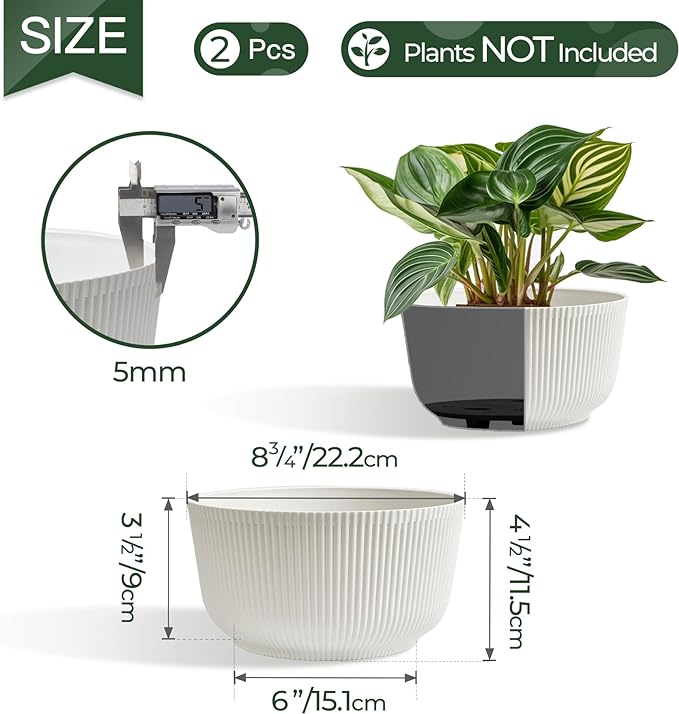 T4U Plant Pots 8 Inch, 2 Pack Self Watering Indoor Planter with Drainage Hole, Shallow Plant Pot, Home Decor Flower Pots for Plants, Herbs, Garden, White