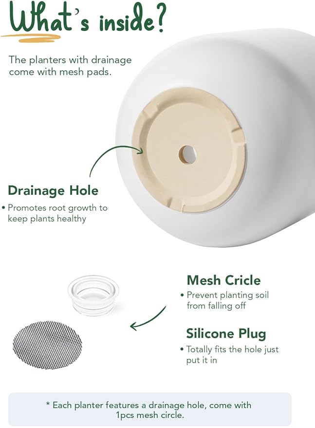 • Drainage Hole & Accessories: Each indoor planter pot features carefully designed drainage hole to maintain optimal soil moisture; The inclusion of silicone plugs and mesh pads provides added convenience, giving you flexibility in how you care for your plants