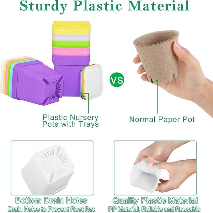 - Premium Plastic Pots: crafted from sturdy plastic, each nursery pot comes with its own tray and adds a splash of color to uplift your mood; approx. 2.76 x 1.97 x 3.15 inches/7 x 5 x 8 cm in size, these lightweight, waterproof pots are reliable and reusable; designed with drainage holes at the bottom, our pots provide excellent drainage without clogging or soil leakage, fostering a healthy environment for your plants to thrive