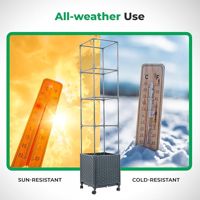 - HIGH QUALITY & DURABILITY: This tomato planter box is made from fade-proof and reinforced PP material, featuring a sturdy alloy steel trellis frame for minimal maintenance. It excels in all-weather conditions, from scorching summers to frigid winters, making it a versatile choice for outdoor plant decoration.