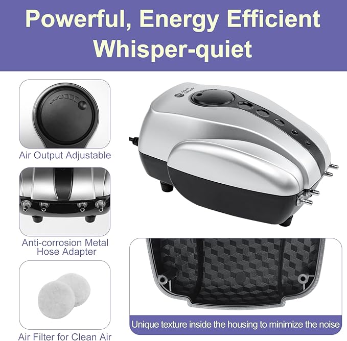- WHISPER-QUIET OPERATION - Experience tranquility with this koi pond aerator, as it operates with minimal noise. The straight airflow path, textured inside-housing design, and vibration-relieving rubber feet ensure super silent operation, providing a peaceful environment for your pond.