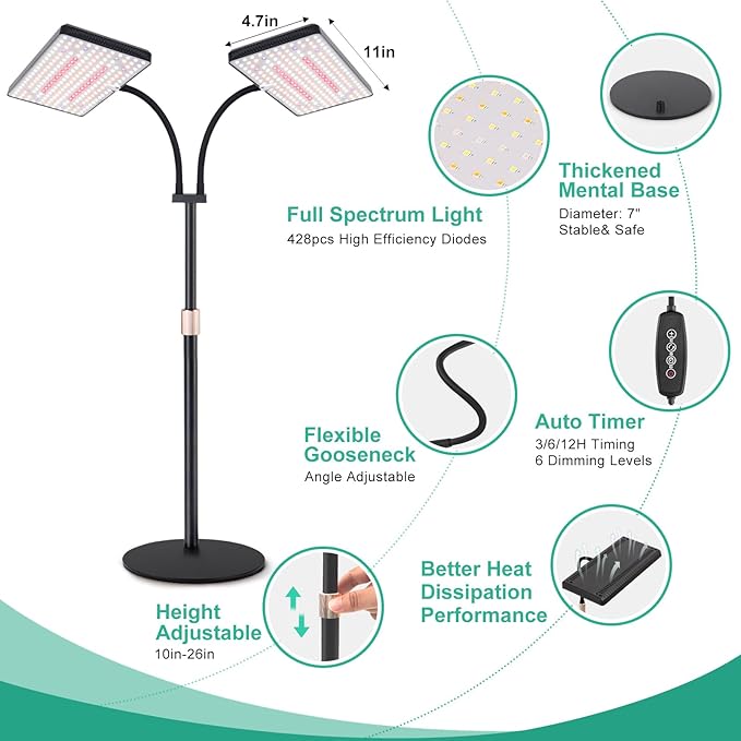 2024 Upgraded Desk Grow Lights for Indoor Plants, Dual-Head 428 LED Tabletop Full Spectrum Grow Light, with 3/6/12H Timer, 6 Brightness Levels, 3 Lighting Modes, Height Adjustable for 10-26 inches