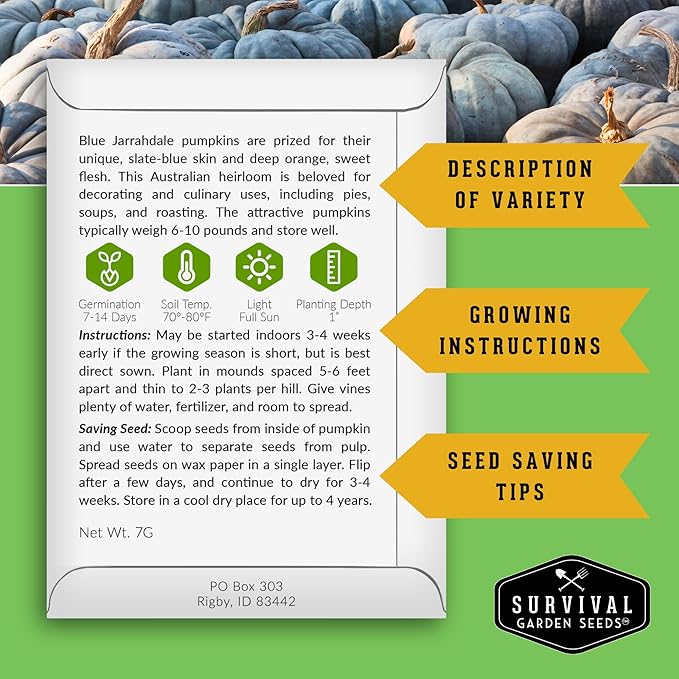 Blue Jarrahdale Pumpkin Seeds for Planting - 2 Packets with Instructions to Plant & Grow Decorative and Flavorful Blue Pumpkins in Your Home Garden - Non-GMO Heirloom Variety - Survival Garden Seeds