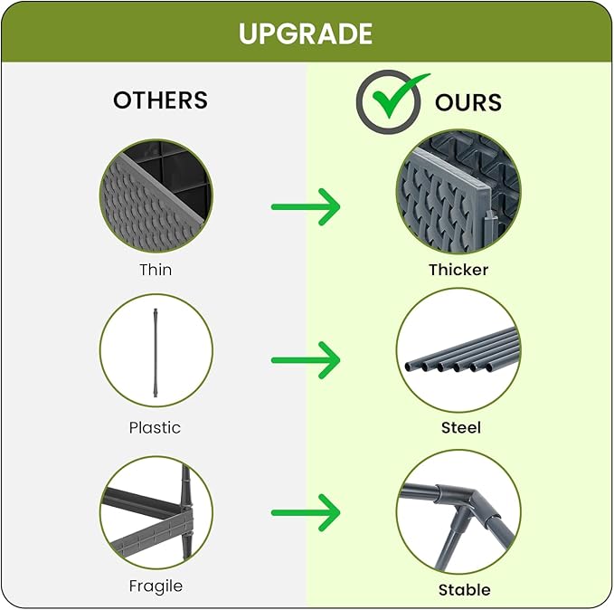 - Durability: Crafted to withstand diverse weather conditions, our raised garden bed planters are UV-resistant, fade-resistant, and built for longevity. Constructed from reinforced polypropylene and sturdy alloy steel for durability. The assembly parts of the tomato plant cage fit together seamlessly, ensuring a sturdy and stable structure that won't easily come apart.
