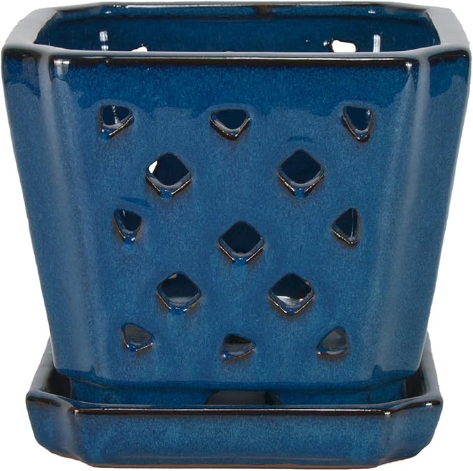 W&W Ceramic Orchid Pot with Holes and Saucer for Repotting, Blue, 7 Inches
