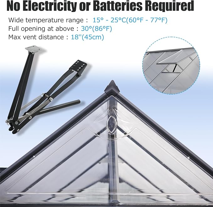 - Wide Temperature Range : Operating between 15°C to 25°C (60°F - 77°F), the greenhouse window opener adapts to various weather conditions. Automatic window opener achieves a full opening at temperatures above 30°C (86°F) and offers a maximum vent distance of 18'' (45cm), promoting optimal air circulation