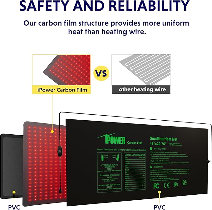 - Energy saving: with upgraded size 48 X 20.75-inch, the heat mat helps you save on electricity while running on only 20W power. You can also easily plug the 5.9 feet Power cord into the sockets you need.