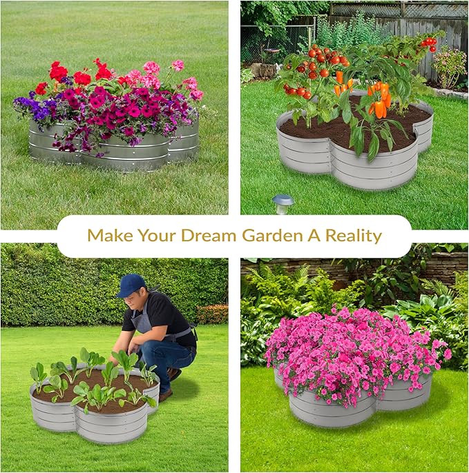 - AMPLE SPACE FOR HEALTHY GROWTH: This galvanized metal garden bed has a unique clover shape that provides plenty of room for growing a variety of deep-rooting plants in the backyard. The raised planter box measures 43" W x 43" D x 12" H, weighs 9.2 lbs, and has a soil capacity of 39.4 gal (5.27 cu ft).