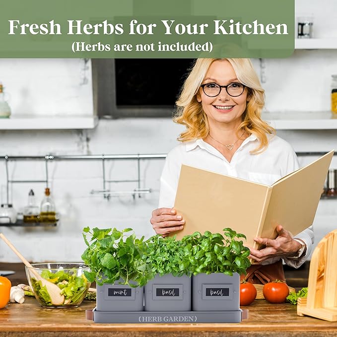 - 【Windowsill Herb Garden】Our window herb garden includes three pots and a tray with a handle, with each pot measuring 4.4" W x 4.7" H, and the tray measuring 14.2" L x 4.9" W x 1.2" H. It's ideal for growing a variety of herbs such as mint, rosemary, basil, thyme, etc. Tailored for herb growth, our indoor herb pots provide an optimal environment for nurturing your herbs. Their farmhouse design and compact size make them perfect for placement on a windowsill or kitchen countertop.