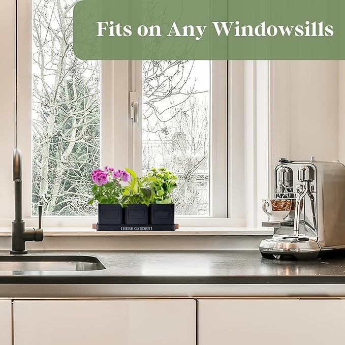 - 【Windowsill Herb Garden】Our window herb garden includes three pots and a tray with a handle, with each pot measuring 4.4" W x 4.7" H, and the tray measuring 14.2" L x 4.9" W x 1.2" H. It's ideal for growing a variety of herbs such as mint, rosemary, basil, thyme, etc. Tailored for herb growth, our indoor herb pots provide an optimal environment for nurturing your herbs. Their farmhouse design and compact size make them perfect for placement on a windowsill or kitchen countertop.