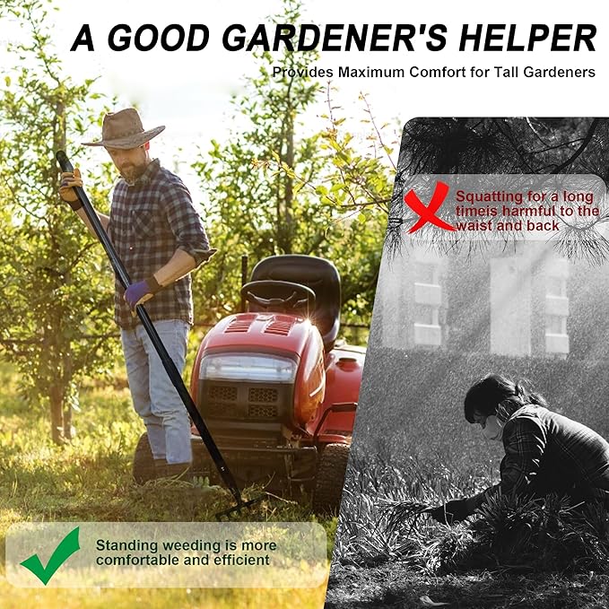- 【Save Your Back and Knees】The handle of Combo hoe and rake is adjusts to 66.5 inches to accommodate gardeners of different heights which is allowing use of the tool both standing up and as a down-on-your-knees hand tool. The ergonomic handle can help protect your back and waist by reducing the need to bend. Length adjustment is quick and easy, just add or remove extension rods! Suitable for both kids and adults, it's ideal for tackling weeds that are difficult to reach.