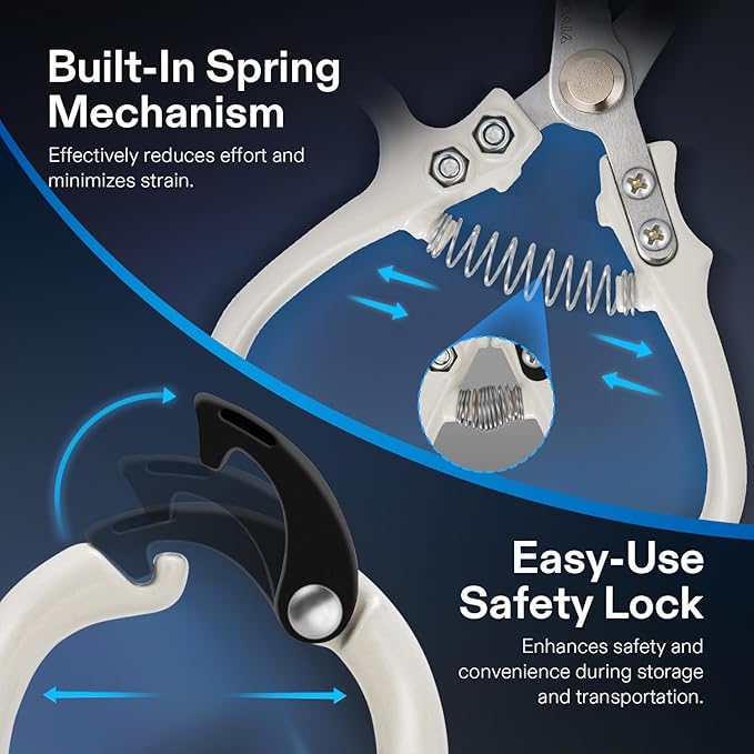 - Ergonomic Handles: Featuring Q-shaped handles that conform to your grip, these shears provide a secure hold for extended use; A built-in spring mechanism gently reopens the blades after each cut, minimizing strain and effort