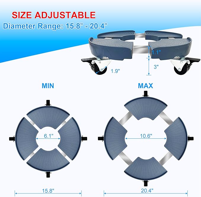 - 【5 Size Holes】Newer version! 5 screw holes in the stainless steel tube correspond to 5 different sizes: 15.8 in, 17.1 in, 18.1 in, 19.2 in, 20.4 in. This 15.8 in - 20.4 in adjustable plant caddy with wheels can perfectly fit your need, suit for most types of pots and items.