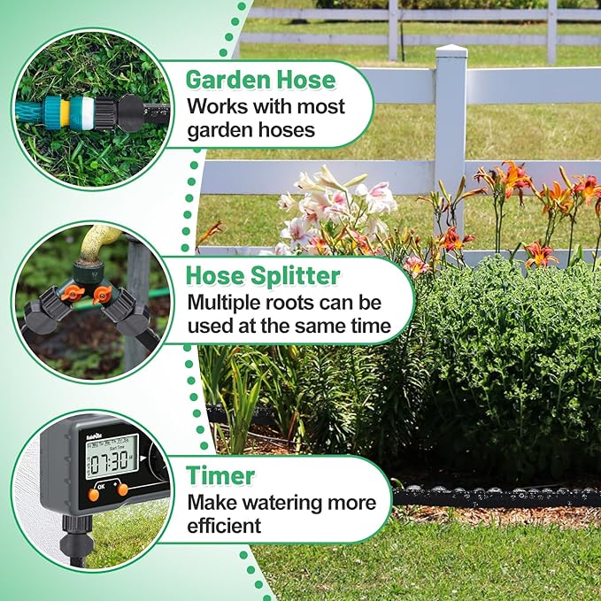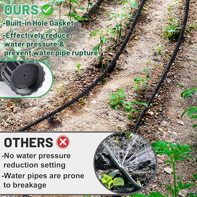 - Easy to Use: Our garden soaker hose, compatible with standard 3/4" threads, effortlessly connects to faucets or other hoses(please make sure the water pressure is within 60PSI), and can also be connected to a timer. Once installed, simply turn on the switch, and it will automatically water your plants, freeing up your hands instantly and making your irrigation process easier and more efficient. The ease of installation allows you to effortlessly build your irrigation system.
