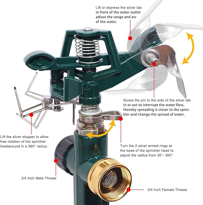 - METAL IMPACT SPRINKLER WITH SPIKE: Heavy duty lawn impact sprinkler head with step spike for yard, lawn and grass Irrigation. The lawn sprinkler can be adjusted from full circles of 360 degrees to partial circle patterns that turn 20 degrees to 340 degrees. Adjust the spray range and radian of water to make the irrigation in the garden fun
