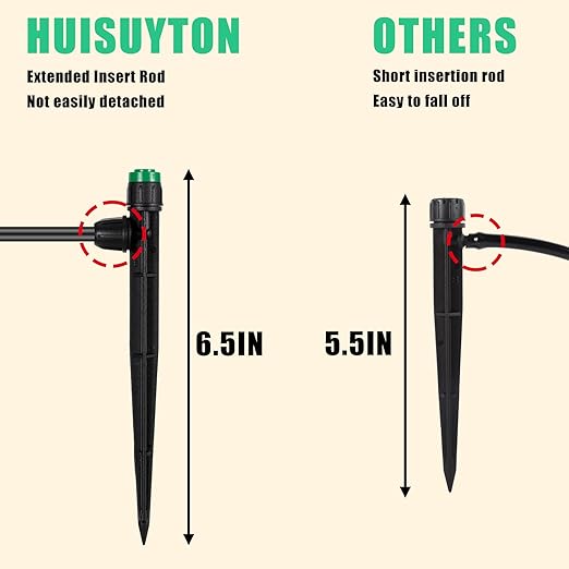 - Quick Connect Design: Upgrade drip irrigation emitter can be connected directly to 1/4" irrigation tubing,not easily detached.And it has been designed with an extended length of 6.5 inches.Easy to install without any other tools.Just push the tube firmly onto the barb and tighten the nut. Locks increases the tightness and will not leak.