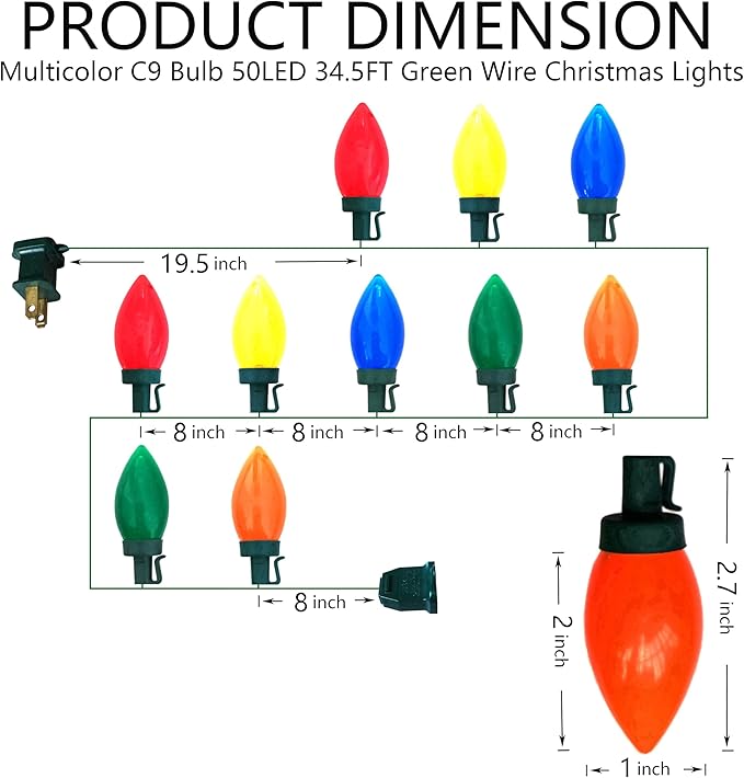 - [Product Dimension] Total length 34.5 Feet including lead cord 19.5 inches, tail cord 8 inches, 8 inches distance between each LED light. The diameter of c9 bulb is 1 inch, the height is 2 inches. Multicolor c9 light is consists of five colors of red, yellow, blue, green and orange. C9 bulbs are the same color as the LED lights.