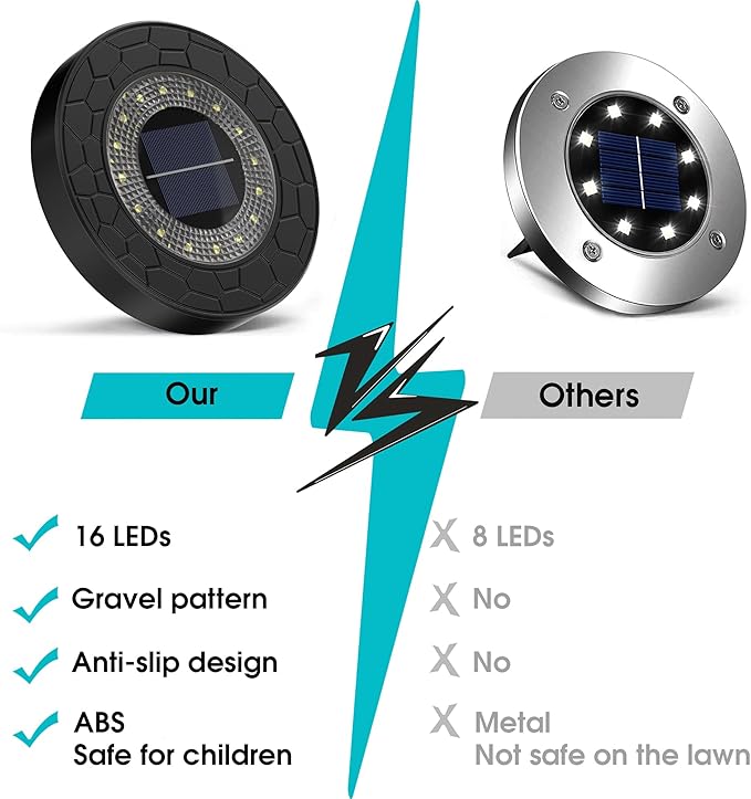 - 2024 New Upgrade: The outdoor solar light has 16 LEDs and a built-in 600 mAh battery. It is brighter than ordinary ground lights. The solar panel uses monocrystalline silicon material, which can fully charge the battery in 6-8 hours, ensuring that the solar light can work for 8-12 hours. You will get a brighter and better looking solar inground light