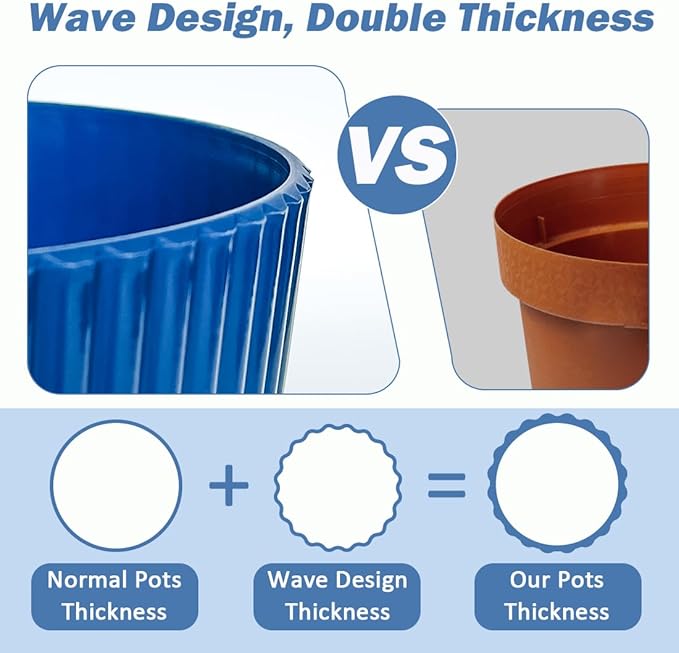 - Vivid Mix-Colores: This set of 6 flower pots comes with 2 light green, 2 dark green, and 2 royal blue, all with a textured design on the outside (or you can even mix and match the colors). All came true to color! You will be in love with how they look in your plant room