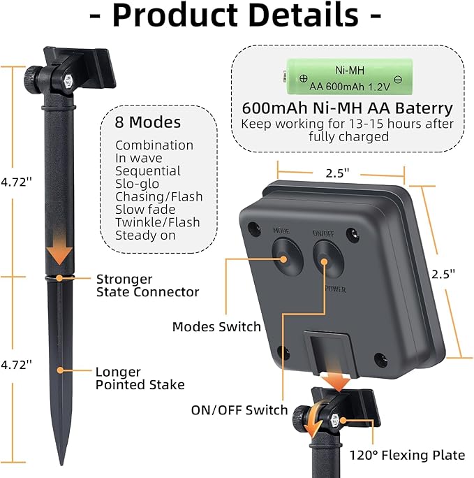 - Special Feature : Solar Powered, Waterproof, 8 Modes