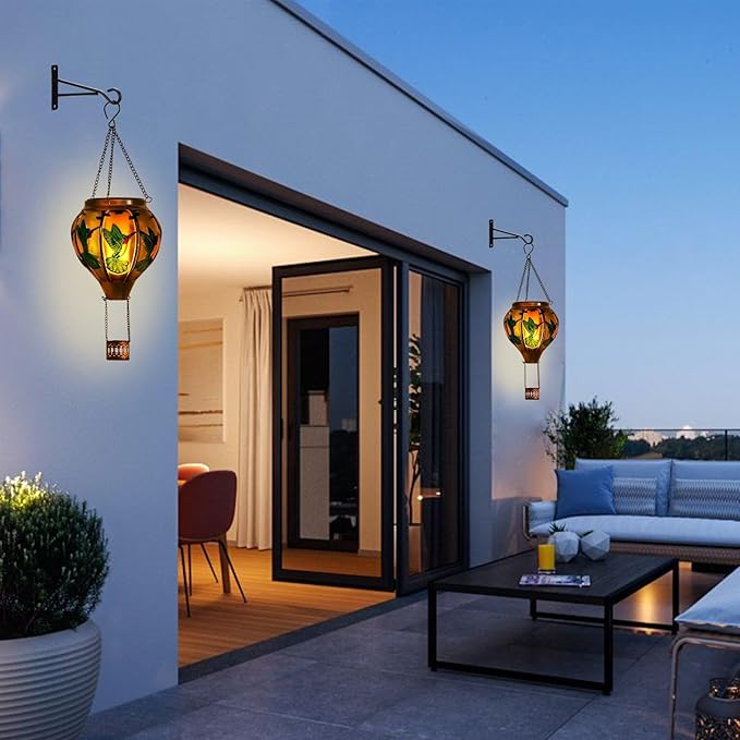 - 【Unique Hot Air Balloon Design】--This hanging solar light is composed of 8 pieces of hummingbird glass with lifelike flame lights. As night falls, their glow adds warmth and comfort to your garden, patio, yard, path, and more, great Christmas decorative lights.